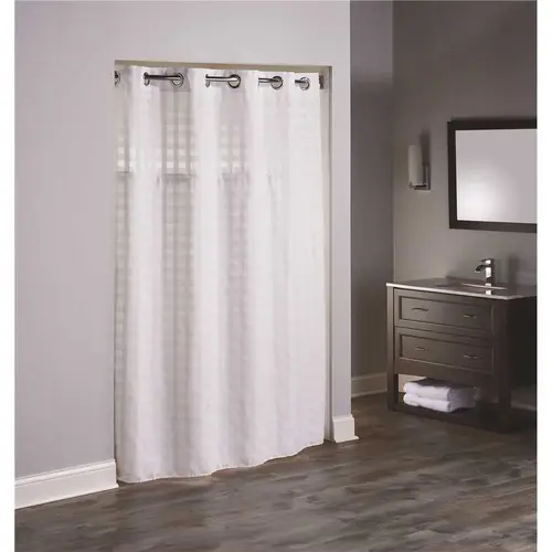 Shimmy Square is a unique sheer and solid check weave pattern Hookless shower curtain constructed of 100% polyester. Check weave textured pattern extends through the sheer voile window for added style. This is a contemporary take on the classic checkerboard shower curtain.