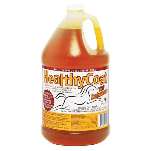 Healthy Coat Horse Supplies Liquid Supplement is an all-natural soy bean oil supplement rich in essential fatty acids, that will improve skin and coat conditions and overall health. This formula contains valuable nutrients rich in linoleic, linolenic fatty acids, Niacin, Biotin and B12. This is an excellent source of energy for performance, stamina and strength. Comes in a delicious apple flavor that your horse will love.