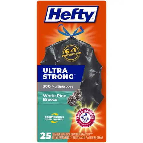 Hefty Ultra Strong is Hefty's strongest drawstring bag, delivering Triple Action Technology to resist tears, punctures and leaks.When you're looking for maximum strength trash bags, look to Hefty® Ultra Strong trash bags. Hefty Ultra Strong trash bags deliver the highest puncture protection available in a flexible bag. They're ideal for those tougher jobs including garage and basement clean-up, storage, donations, yard cleanup and home construction clean-up.