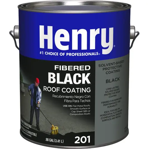 Henry 201 Fibered asphalt roof coating is a premium cold applied, brush or spray grade asphalt coating in a solvent system. It is a penetrating-type protective coating formulated to provide a tough, durable, weather-resistant film. The solvent system allows working at lower temperatures than with asphalt emulsions and the coating won't wash off if unexpected rain occurs before curing.