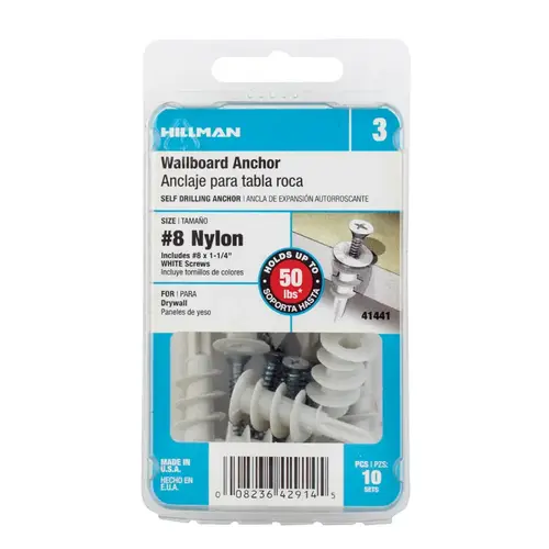 • Self-drilling, one-piece anchor for mounting to wallboard. No pre-drilling or hole preparation needed. Can be easily backed out and removed. Nylon White Flat Head Phillips sheet metal screws included (8 x 1-1/4")