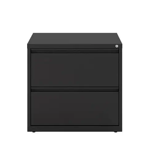 Hirsh 30 inch Wide 2 Drawer Metal Lateral File Cabinet Blk Legal or Letter. Commercial Grade Ball-Bearing Suspension Allows Fully Loaded Drawers To Open With Ease. Durable, fully assembled steel construction with non-porous surface is easy to clean and disinfect. Hangrails, counterweights, four adjustable leveling glides and magnetic label holders included. Lock included to keep contents of all drawers secure. Reinforced base construction for extra structural rigidity. Drawer interlock system inhibits tipover. Dual lock bars secure both sides of drawers. Accommodates letter, legal and A4 size hanging files. Full-width J-pull handles. Limited Lifetime Warranty. Meets or exceeds ANSI-BIFMA standards. Greenguard Gold Certified. Powder Coat finish. Mfg #14971