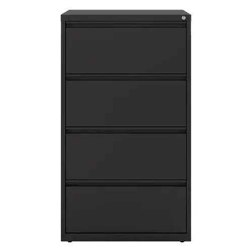 Hirsh 30" Wide 4 Drawer Metal Lateral File Cabinet Black. Commercial Grade Ball-Bearing Suspension Allows Fully Loaded Drawers To Open With Ease. Durable, fully assembled steel construction with non-porous surface is easy to clean and disinfect. Hangrails, counterweights, four adjustable leveling glides and magnetic label holders included. Lock included to keep contents of all drawers secure. Reinforced base construction for extra structural rigidity. Drawer interlock system inhibits tipover. Dual lock bars secure both sides of drawers. Accommodates letter, legal and A4 size hanging files. Full-width J-pull handles. Limited Lifetime Warranty. Meets or exceeds ANSI-BIFMA standards. Greenguard Gold Certified. Powder Coat finish. Mfg #14977