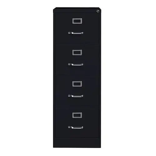 Hirsh 26.5" Deep 4 Drawer Legal Metal Vertical File Cabinet Commercial Black. Commercial Grade Ball-Bearing Suspension Allows Fully Loaded Drawers To Open With Ease. Durable, fully assembled steel construction with non-porous surface is easy to clean. Full metal follower block keeps files upright and organized. Lock included to keep contents of all drawers secure. Aluminum handles and label holders. Accommodates legal-size hanging files. Limited Lifetime Warranty. Meets or exceeds ANSI-BIFMA standards. Greenguard Gold Certified. TAA Compliant. Mfg #16702
