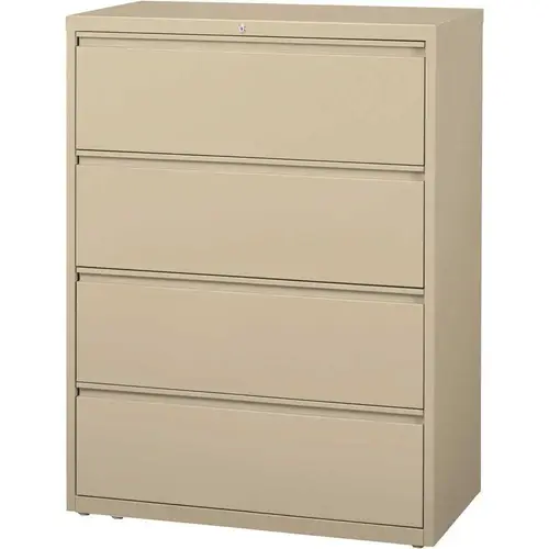This 42 in. Wide 4-Drawer commercial grade lateral filing cabinet is designed for heavy duty use, yet looks great in any office. Precision ball-bearing suspension allows for quiet use in your busy office environment. Fully assembled steel construction with reinforced base. Non-porous surface is easy to clean and disinfect. Interlock system prevents tipping by only allowing 1-Drawer open at a time. Dual lock bars and core-removable lock come standard. Unit includes hang rails, magnetic label holders, and 4-Adjustable leveling glides. Greenguard Gold certified for indoor air quality. Meets or exceeds ANSI-BIFMA standards. TAA compliant. Limited Lifetime Warranty.