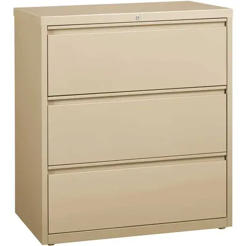 This 36 in. Wide 3-Drawer commercial grade lateral filing cabinet is designed for heavy duty use, yet looks great in any office. Precision ball-bearing suspension allows for quiet use in your busy office environment. Fully assembled steel construction with reinforced base. Non-porous surface is easy to clean and disinfect. Interlock system prevents tipping by only allowing 1-Drawer open at a time. Dual lock bars and core-removable lock come standard. Unit includes hang rails, magnetic label holders, and 4-Adjustable leveling glides. Greenguard Gold certified for indoor air quality. Meets or exceeds ANSI-BIFMA standards. TAA compliant. Limited Lifetime Warranty.