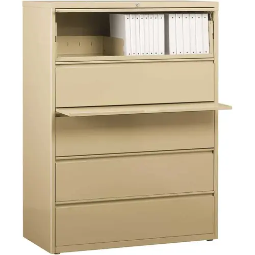 This 42 in. Wide 5-Drawer commercial grade lateral filing cabinet is designed for heavy duty use, yet looks great in any office. Precision ball-bearing suspension allows for quiet use in your busy office environment. Fully assembled steel construction with reinforced base. Non-porous surface is easy to clean and disinfect. Interlock system prevents tipping by only allowing 1-Drawer open at a time. Dual lock bars and core-removable lock come standard. The top Drawer features a roll-out shelf designed to accommodate 3-ring binders. Unit includes hang rails, magnetic label holders, posting shelf, and 4-Adjustable leveling glides. Greenguard Gold certified for indoor air quality. Meets or exceeds ANSI-BIFMA standards. TAA compliant. Limited Lifetime Warranty.