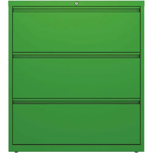Hirsh 36" Wide 2 Drwr Metal Lateral File Cabinet Letter/Legal/A4 Screamin' Green Commercial Grade Ball-Bearing Suspension Allows Fully Loaded Drawers To Open With Ease Durable, fully assembled steel construction with non-porous surface is easy to clean Hangrails, counterweights, four adjustable leveling glides and magnetic label holders included Lock included to keep contents of all drawers secure Reinforced base construction for extra structural rigidity Drawer interlock system inhibits tipover Dual lock bars secure both sides of drawers Accommodates letter, legal and A4 size hanging files Full-width J-pull handles Limited Lifetime Warranty Meets or exceeds ANSI-BIFMA standards Greenguard Gold Certified Powder Coat finish Mfg #24250