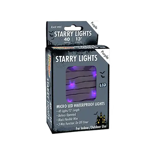 40 Light, Purple, Battery Operated, LED Micro Light Set, Black Wire, Halloween Edition Extended Battery, On/Off/Timer Mode, 13' Long, Counter Display Holds 24 With Try Me Button.