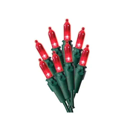 Holiday Wonderland, 50 Count, Red, LED Traditional Mini Bulb Light Set, Green Wire, 3" Spacing, 12" Lead, 4" End, 12.25' Lighted Length, 13.6' Total Length.