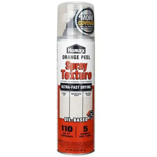 Homax Orange peel oil-based texture is the fastest way to patch "orange peel" drywall textures. Variations in the orange peel texture (also called splatter or eggshell) help hide surface imperfections, while reflecting light and adding interest to a room. Our oil-based texture excels at replicating a wide range of orange peel texture patterns so you can get professional results fast. Drying in as little as five min, it can be painted over to blend into the surrounding surface. Damaged orange peel textured walls can be a challenge to repair. Matching the existing texture is critical to achieving a professional, flawless finish. Homax makes it easier with our popular aerosol texture repair products.