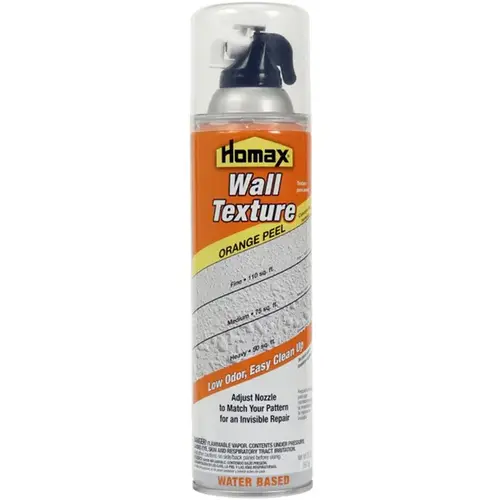 Homax Orange peel water-based aerosol wall texture is a low-odor, water-based formulation of our most popular "orange peel" and splatter texture for textured drywall repair. Variations in orange peel texture (also called splatter or eggshell) help hide surface imperfections, while reflecting light and adding interest to a room. Our water-based formula excels at replicating orange peel texture patterns so you can get professional results fast. Great for patching and texturing small rooms and accent walls. Low-odor water-based formulation of our most popular "orange peel" and splatter texture. Match a wide range of texture patterns with the advantage of water cleanup. This fast-drying spray texture is a great choice for patching in occupied spaces like offices, schools and hospitals.
