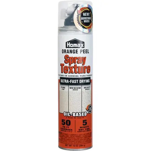 Homax Orange peel oil-based wall texture is the fastest way to patch "orange peel" drywall textures. Variations in orange peel texture (also called splatter or eggshell) help hide surface imperfections, while reflecting light and adding interest to a room. Our oil-based wall texture formula excels at replicating orange peel texture patterns so you can get professional results fast. Drying in as little as five minutes, it can be painted over to blend into the surrounding surface. The ultra-fast drying texture excels at replicating superfine orange peel finishes and is preferred by both contractors and DIYers who seek fast job completion.