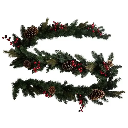 Hometown Holidays Pine Cone and Red Berry Garland, PVC, Green/Red/Gold, 1.5 years Average Life, Hangtag Mounting, Dimensions: 9 ft, Includes: Berries, Ornaments, Holly