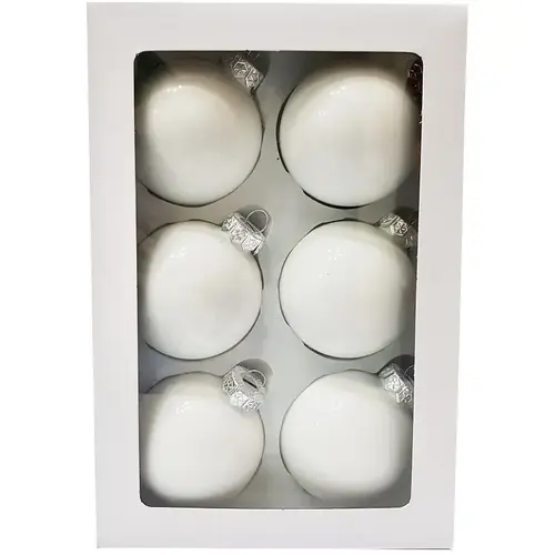 Traditional white shiny Christmas ornaments are a lovely addition to your holiday decor. These beautiful ornaments are packaged in a acetate box that can be used to store the ornaments away after the season.