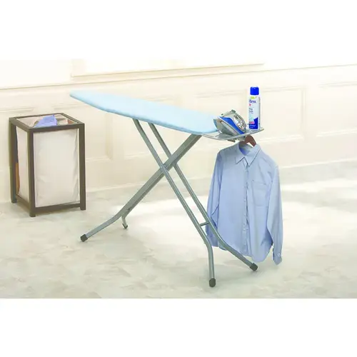 Premium heavy duty ironing board. 54" X 14" mesh top for improved steam flow. Heavy duty rectangular leg for superior support and durability. Built in premium iron rest. Stamped metal for added strength. Silicone pads to dissipae heat. Angled support to prevent steam flow when not in use. Integrated garment Hanger For Pressed Clothing. Recessed area for storage of water or starch bottles.