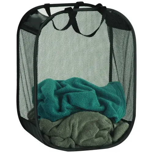 This black mesh hamper pops-up to open and easily compresses flat when not in use. The mesh material provides excellent ventilation allowing worn clothes to breathe and reducing unpleasant odors and mildew. Useful carrying handles make transporting clothes to the laundry room, Laundromat or dry cleaner a breeze. Keep clothes off of the floor and your space neat and clean with this practical and fun hamper.