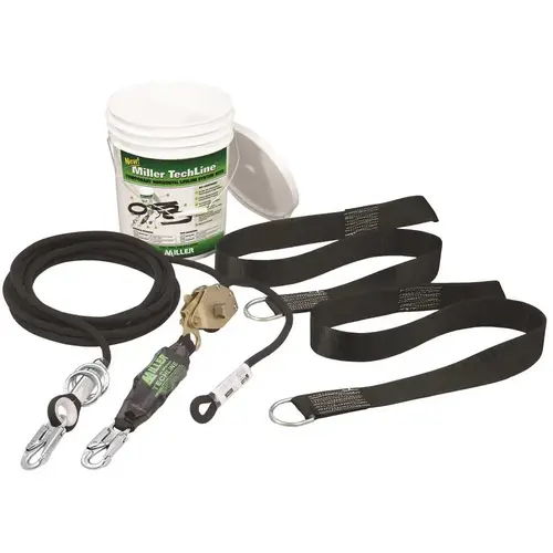 As the industry leader for more than five decades, Honeywell Safety Products provides a comprehensive line of Miller brand fall protection. The Miller TechLine Temporary Horizontal Rope Lifeline is a premium system for two workers. The black static kernmantle lifeline provides ultimate durability for tough environments while reducing fall clearance requirements. An in-line system shock absorber reduces forces while O-ring connections allow for ease of mobility. The system is quick and easy to install, lightweight and portable. Designed so anchorage points only need to be rated for 5,000 lbs. (22kN). Kit contains 11/16-in. (17.5mmm) kernmantle-style rope lifeline, lifeline adjuster, two (2) heavy-duty cross-arm anchorage straps, shock absorber pack, two (2) connecting O-rings and waterproof bucket for safe storage.
