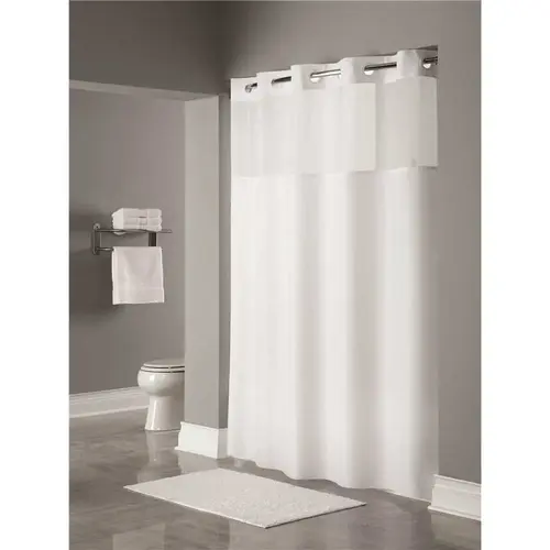 Hookless Shower Curtains hang in just seconds, saving you time, which saves you money on labor. With our Flex-On rings, there is no need to purchase additional hooks or rings. The Mystery Hookless Shower Curtain features our plain weave polyester fabric with our signature sheer voile window.
