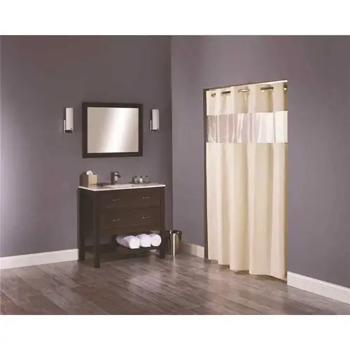 Hookless Shower Curtains hang in just seconds, saving you time, which saves you money on labor. With our Flex-On rings, there is no need to purchase additional hooks or rings. The Major Hookless Shower Curtain features a moire water effect pattern with a bubble vinyl window.