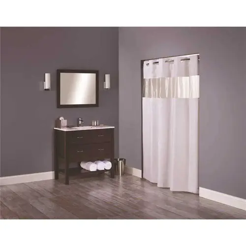 Hookless Shower Curtains hang in just seconds, saving you time, which saves you money on labor. With our Flex-On rings, there is no need to purchase additional hooks or rings. The Major Hookless Shower Curtain features a moire water effect pattern with a bubble vinyl window.