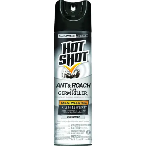 HOT SHOT Ant, 17.5 oz Net Content, Aerosol Container, Liquid Form, Usage Location: Indoor, Outdoor, Pyrethroid, Solvent Odor/Scent, Clear/Yellow, Compositions: Hydrotreated Light Petroleum Distillates, Imiprothrin, Isobutane, 1-Butoxy-2-Propanol, Lambda-Cyhalothrin, Light Aromatic Naptha, Propane, Spray Application Method, 0.9386 Density, 6.52 pH