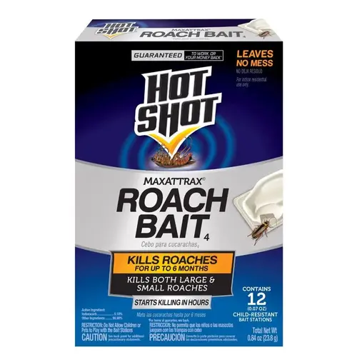 Hot Shot MaxAttrax Roach Bait kills both large and small roaches and the eggs they carry. The attractant draws roaches to the bait stations, then the roaches eat the bait and crawl away to die. This product contains 12 child-resistant bait stations, with each bait station lasting up to 6 months.