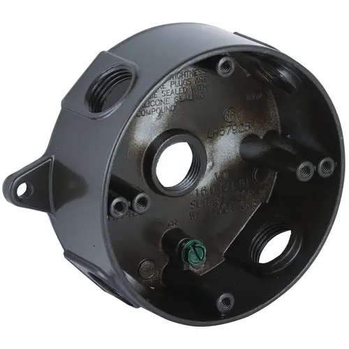For use in branch circuit wiring in wet, damp or dry locations. Designed for use as a weatherproof junction box and used with Bell round cluster covers and round lamp holder combinations. Die-cast aluminum construction. Powder coat finish. Reinforced connector outlets. Cast-in mounting lugs, four closure plugs included and installed ground screw. 16.1 cu-in capacity. Six 10-24 tapped holes. 4 in Dia x 1-1/2 in D. UL listed.