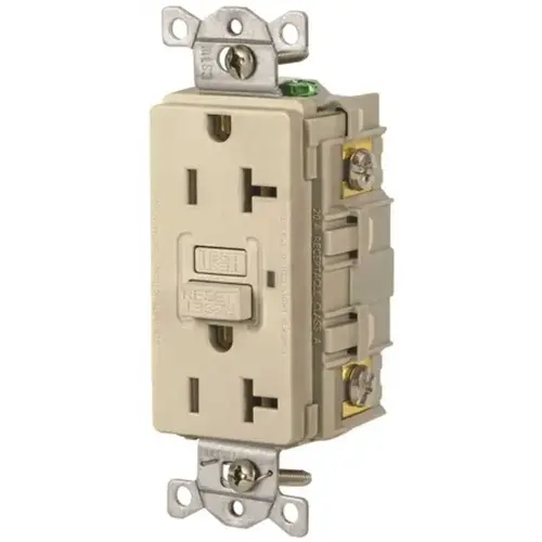 Hubbell Wiring Heavy Duty Commercial AUTOGUARD Self-Test GFCI, 20A, Ivory Hubbell Commercial Grade Gfci Two Outlet Receptacle Ivory Nylon 20A, 125V Not Tamper-Resistant Back Wired, Side Wired And Tri-Drive Screw NEMA 5-20R Double Pole Patented AutoGuard Self-Test Technology Patented Auto Monitor, Power Denial Technology LED Indicators: Power (Green), Trip Ground Fault (Red) And End-Of-Life (Flashing Red) UL Listed Mfg #GFR20I Mfg #GFR20I