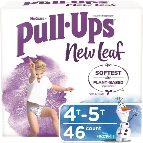 Introducing Pull-Ups New Leaf Training Pants, the softest training underwear made with plant-based ingredients for healthy skin. Clinically proven to be hypoallergenic and made without harsh ingredients, New Leaf training pants provide up to 12-hours of outstanding leak protection. Made with a cottony-soft and breathable material, New Leaf training pants are designed to help keep your child comfortable while potty training-because once they're comfortable, Confidence Comes Naturally. Pull-Ups New Leaf training pants also provide soft, refastenable sides for an adjustable waistband and quick changes on-the-go or at home. Plus an underwear-like design with easy up and down motion helps promote learning and Big Kid independence. Featuring your favorite Frozen II characters, each pack includes front and back designs of Disney's Olaf, Sven and Kristoff, with graphics that fade when wet for a fun way to help him learn. When your child is ready to begin his potty training journey, the Pull-Ups brand can help. Visit pull-ups for expert articles, tips and potty training resources. We've helped train 50 million Big Kids and counting. Pull-Ups New Leaf Training Pants are available in sizes 2T-3T (16 lbs. to 34 lbs.), 3T-4T (32 lbs. to 40 lbs.) and 4T-5T (38 lbs. to 50 lbs.). (28% by weight).