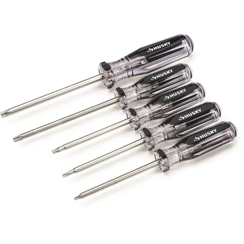 Designed with an impact and chemical resistant handle, this Torx Screwdriver Set includes 5 different screwdriver tips forged from high strength alloy steel. The Ergonomic handle helps reduce user fatigue. Works with most common size Torx fasteners.