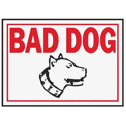All aluminum white with red letters. Weather-resistant and durable. Sign states "BAD DOG".