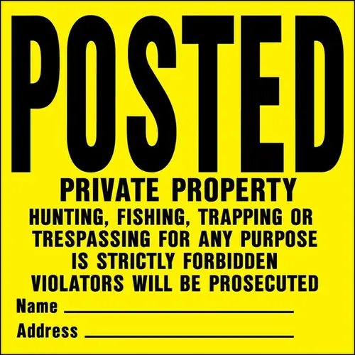 Made of durable weatherproof plastic. Yellow background with black lettering. States "POSTED...PRIVATE PROPERTY...HUNTING, FISHING, TRAPPING, OR...TRESPASSING FOR ANY PURPOSE...IS STRICTLY FORBIDDEN...VIOLATORS WILL BE PROSECUTED" and also has slots for both name and address.