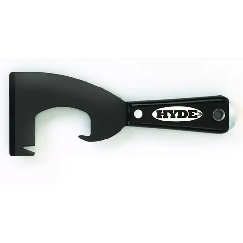 Heavy-duty pail opener with sharp hook cutter for removing plastic 5 gal bucket lids and pail tops. Electrocoated 3 in scraper/spreader blade and durable nylon handle with Hammer head end for setting popped nails and screws. Full-tang blade.