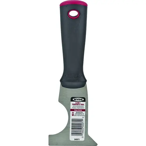 Economical putty knife with many uses. 2-1/2 in Hardened carbon steel scraper blade. Putty remover. Spreader. Half round cut-out removes paint from paint rollers. Sharp point opens cracks for patching.
