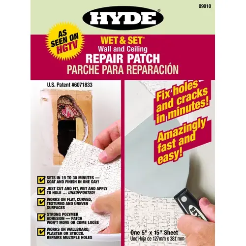 With this revolutionary fabric patch, you simply cut, wet and press the Wet & Set patch over the damaged area. It dries hard in minutes, forming a polymer adhesion that will never peel or delaminate. Stains, holes, cracks and crumbling damage disappear within seconds, replaced by a hard, permanent patch that's ready for a finish coat within 15 to 30 mins. Can be used on drywall, plaster, stucco and even wood.