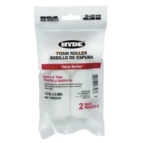 4 in value series mini foam roller, 1/2 in NAP, round end, 2 per pack. Foam mini roller with closed end, for use with latex paint, water based varnishes and stains.