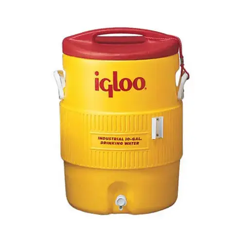 Improved, heavy-duty side handles mounted with stainless steel screws into ABS plastic back-up plate. Cup dispenser bracket. Plastic, recessed, drip-proof, pushbutton spigot. Wide mouth, pressure fit lid has molded-in contour handle and keeper cord. Safety color for easy identification, will not fade in direct sunlight. All plastic, rustproof construction. Sanitary white liner. Foamed-in-place Ultratherm insulation. Drinking Water imprint meets OSHA requirements.