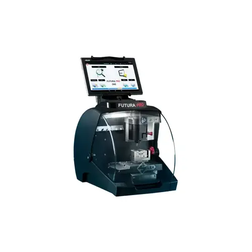Controlled by a removable 10in (254 mm) touch-screen tablet, the Futura Pro One guides the user step-by-step in all key cutting operations; for example, in selecting the make, model and year for automotive keys, selecting the cutter, clamp, etc. Designed and Engineered with just one cutting station to originate, decode and copy laser and dimple keys. Powerful enough for the professional and ideal for inexperienced users with the step-by-step prompts throughout the cutting process.