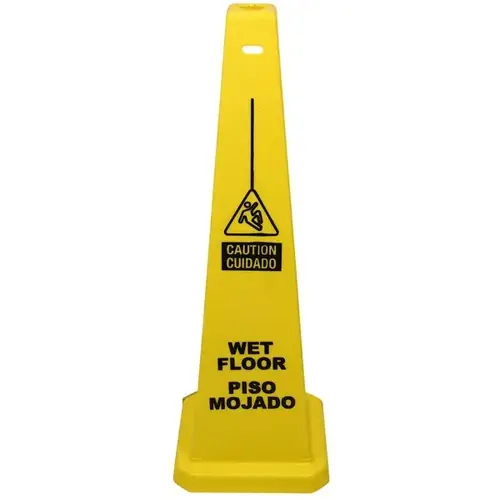 This wet floor sign is a highly visible yellow. Printed on all 4 sides. High-contrast text.
