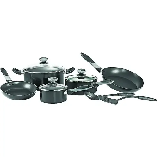Non-stick interior with tempered glass covers. Set includes 5 qt. covered Dutch oven, 8 in and 10 in fry pans, 1 qt and 2 qt covered sauce pans and slotted spoon and spatula. Dishwasher-safe.