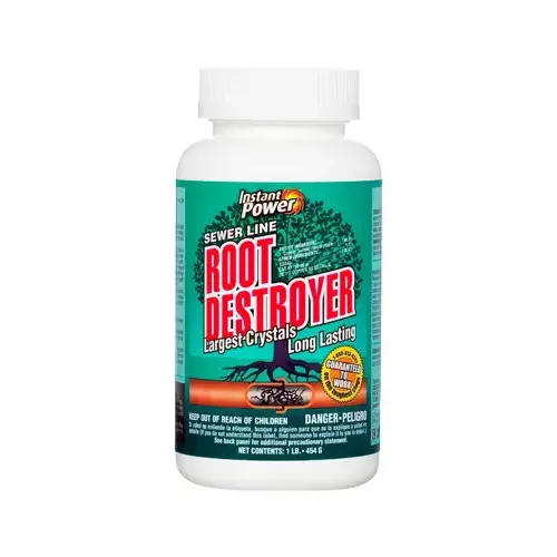 Our Root Destroyer is a twice-per-year application for tree and plant roots invading sewer lines. After roots have accumulated sufficient copper sulfate the roots will die and begin to decay and water flow will increase. As the roots re-grow, follow-up treatments will be required. Applications may be made twice a year in the spring after plant growth begins, and during late summer or early fall, or any time a reduced water flow, thought to be caused by root growth, occurs. Instant Power Root Destroyer uses the largest copper sulfate crystals available for longer lasting results.