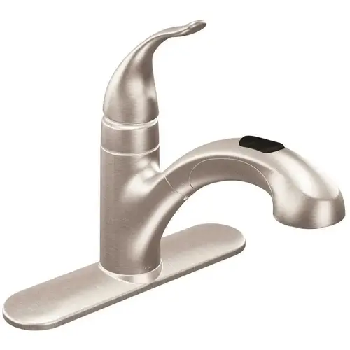 Ergonomically designed with modern functionality, the Integra collection from MOEN contributes to an urban appeal and clean, contemporary aesthetic. The easy-to-use Integra is perfect for your kitchen or laundry room and features a single-finger control button spout, which allows you to effortlessly switch from a forceful stream to a soft aerated spray. This dual-function pull-out spout offers flexible reach around all corners of your sink and makes it easy to fill tall containers. Even more, this model features MOEN's exclusive Spot Resist finish that resists fingerprints and water spots to maintain its original brilliance and easily wipes clean, ensuring the beautiful stainless appearance will continue to shine over time.