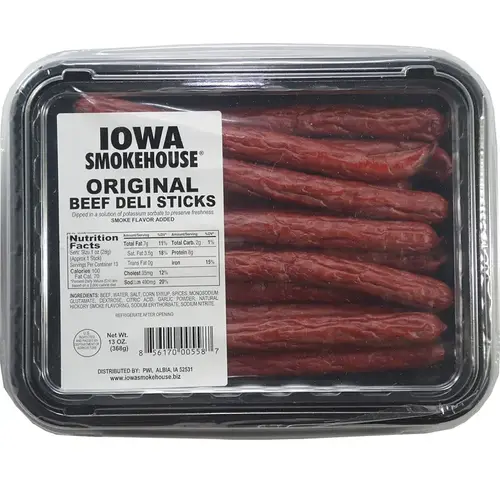 Iowa Smokehouse Beef Deli Stick, Pack, Net Content: 13 oz, Flavor: Original, Nutritional Information: 100 Calories, 7 g Total Fat, 3.5 g Saturated Fat, 0 g Trans Fat, 35 mg Cholesterol, 490 mg Sodium, 2 g Total Carbs, 8 g Protein, Ingredients: Beef, Water, Salt, Corn Syrup, Spices, Monosodium Glutamate, Dextrose, Citric Acid, Garlic Powder, Natural Hickory Smoke Flavoring, Sodium Erythorbate, Sodium Nitrite, Servings: 13