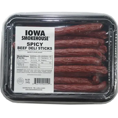 Iowa Smokehouse Beef Deli Stick, Pack, Net Content: 13 oz, Flavor: Spicy, Nutritional Information: 100 Calories, 7 g Total Fat, 3.5 g Saturated Fat, 0 g Trans Fat, 35 mg Cholesterol, 490 mg Sodium, 2 g Total Carbs, 8 g Protein, Ingredients: Beef, Water, Salt, Corn Syrup, Spices, Monosodium Glutamate, Dextrose, Citric Acid, Garlic Powder, Natural Hickory Smoke Flavoring, Sodium Erythorbate, Sodium Nitrite, Servings: 13