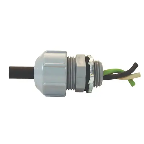 PVC threaded strain relief connector includes metal locking ring and grommets to accommodate a wide range of round and oval cable. Weatherproof.