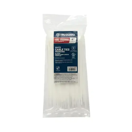 TRU-GUARD, 100 Pack, 8" White mounting cable tie, nylon, 50lb tensile strength, bagged.