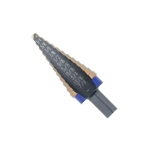 High speed steel bit with single flute cutting edge for greater control through steps; hex shank prevents slipping in drill chuck. SpeedPoint tip penetrates faster and prevents walking in applications such as drilling holes into thin materials such as stainless steel, copper, brass, aluminum, plastic and laminates.