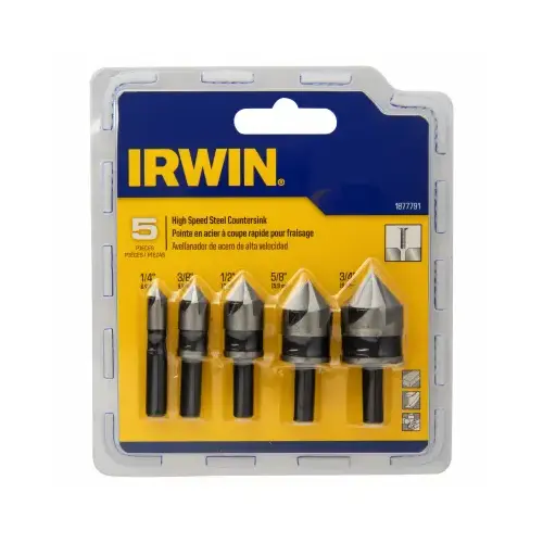 The Irwin countersink set is easy to use. Comes with a 1/4 in shank. This countersink set is made of high-speed steel with a black oxide finish. Includes 1/4 in, 3/8 in, 1/2 in, 5/8 in, 3/4 in Countersinks. Packaged 5 pieces per set. Sales of these products are intended for industrial business end users.