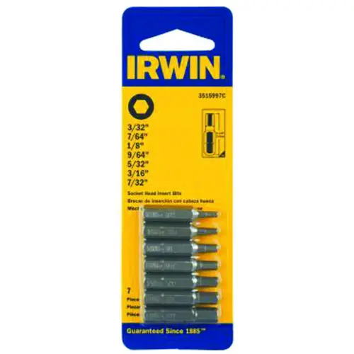 Socket head insert bits. Includes point sizes including 3/32, 7/64, 1/8, 9/64, 5/32, 3/16 and 7/32 in. Hex shank of size 1/4 in.